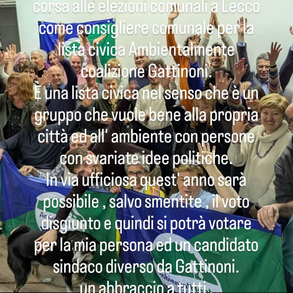 Buongiorno a maggio 2026 sono in corsa alle elezioni comunali a Lecco come consigliere comunale per la lista civica Ambientalmente coalizione Gattinoni.È una lista civica nel senso che è un gruppo che vuole bene alla propria città ed all’ ambiente con persone con svariate idee politiche.In via ufficiosa quest’ anno sarà possibile , salvo smentite , il voto disgiunto e quindi si potrà votare per la mia persona ed un candidato sindaco diverso da Gattinoni.un abbraccio a tutti .cordialmente